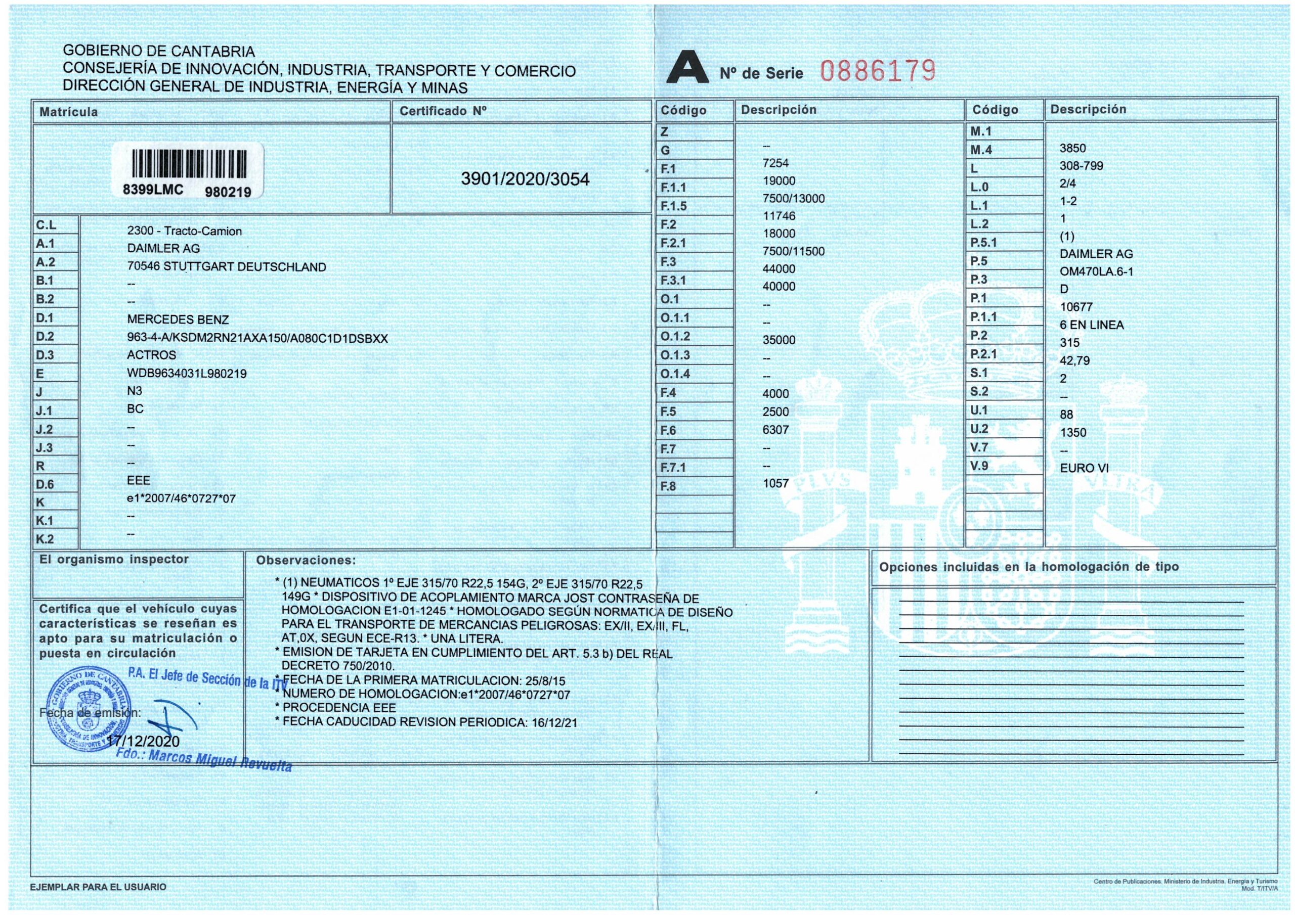 - ADR homologado para el transporte de mercancías peligrosas: EX/II, EX/III, FL, AT, OX, según ECE-R13