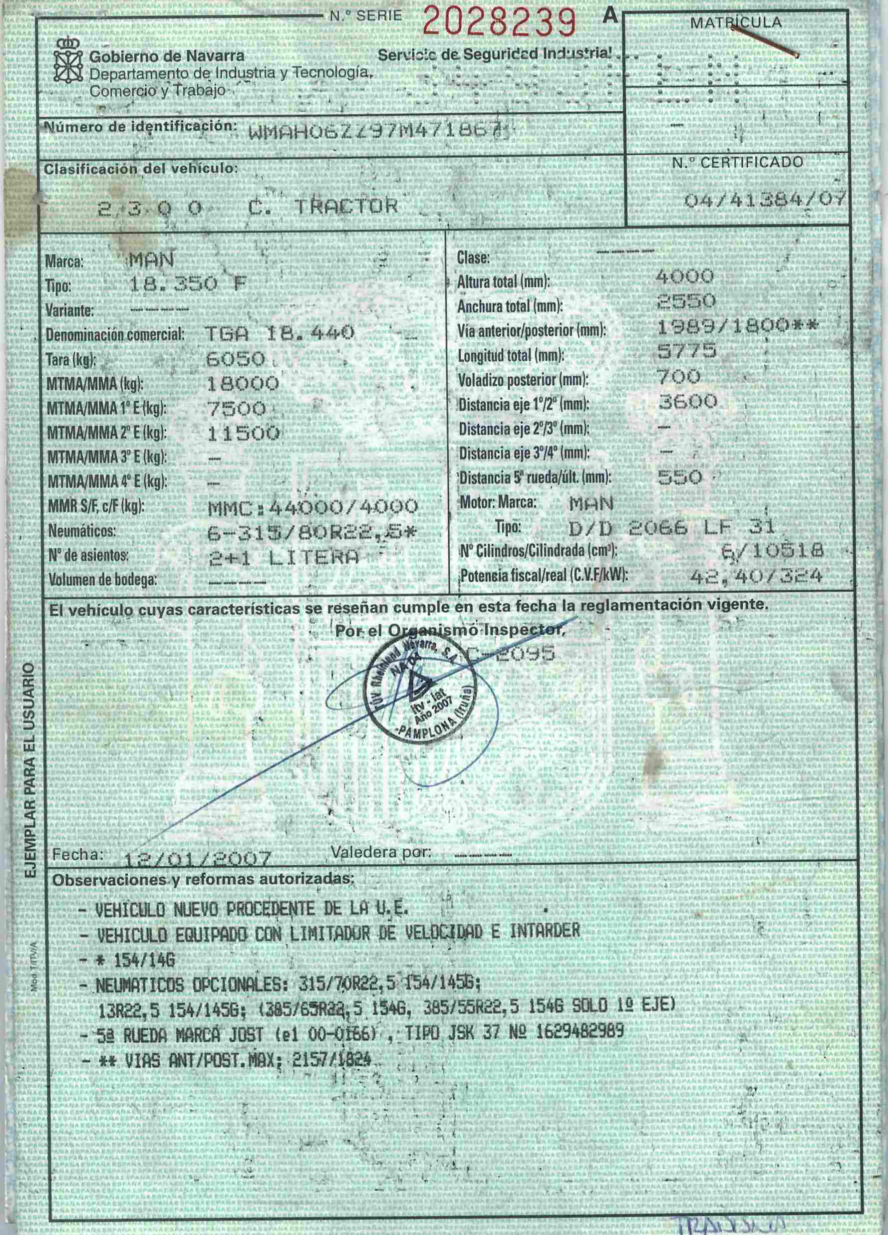 Disponible en nuestras instalaciones de Burgos (España). Si desean ampliar la información de la cabeza tractora Man no duden en contactar con nosotros.