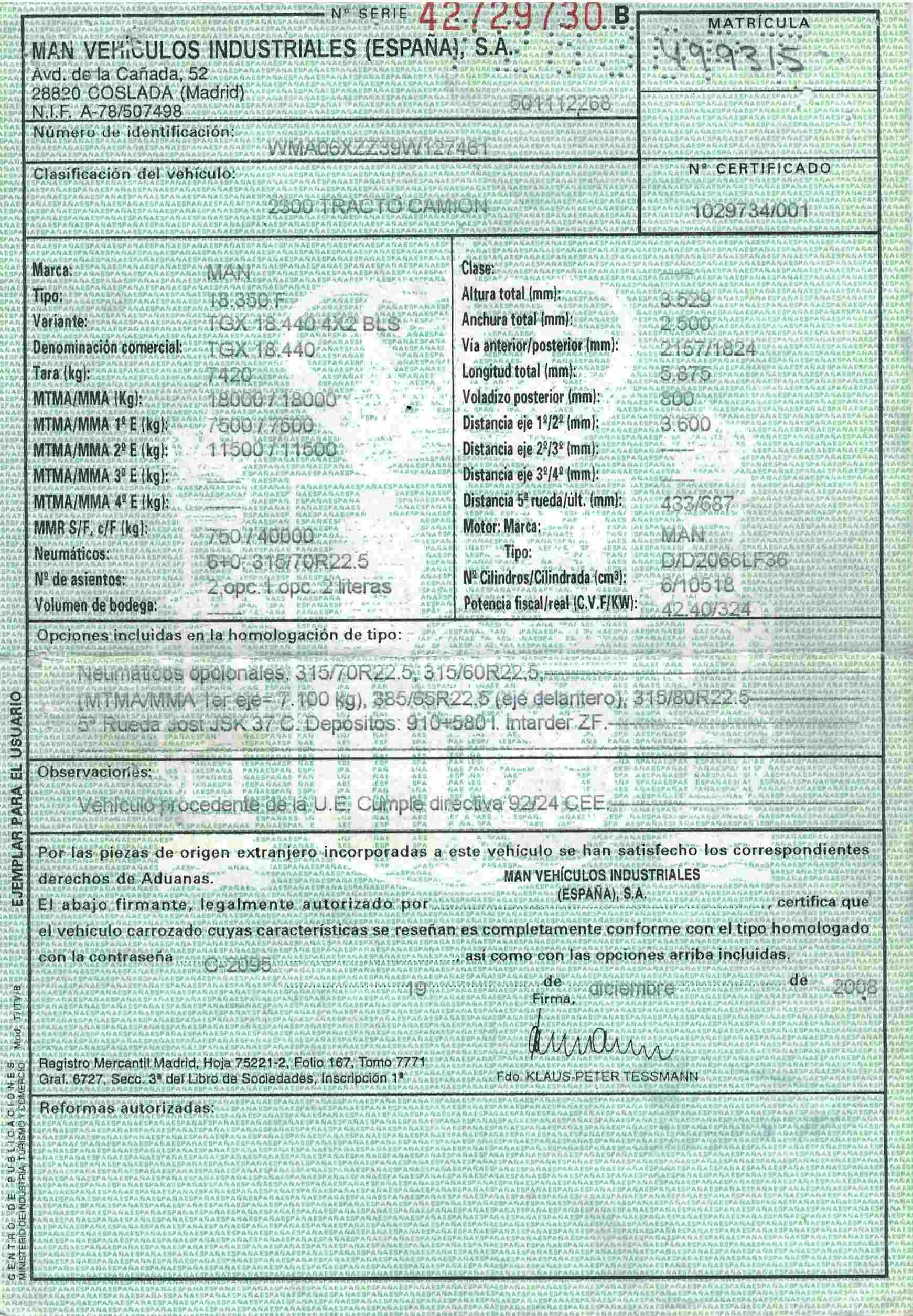 Disponible en nuestras instalaciones de Burgos (España). Si desean ampliar la información de la cabeza tractora Man no duden en contactar con nosotros.