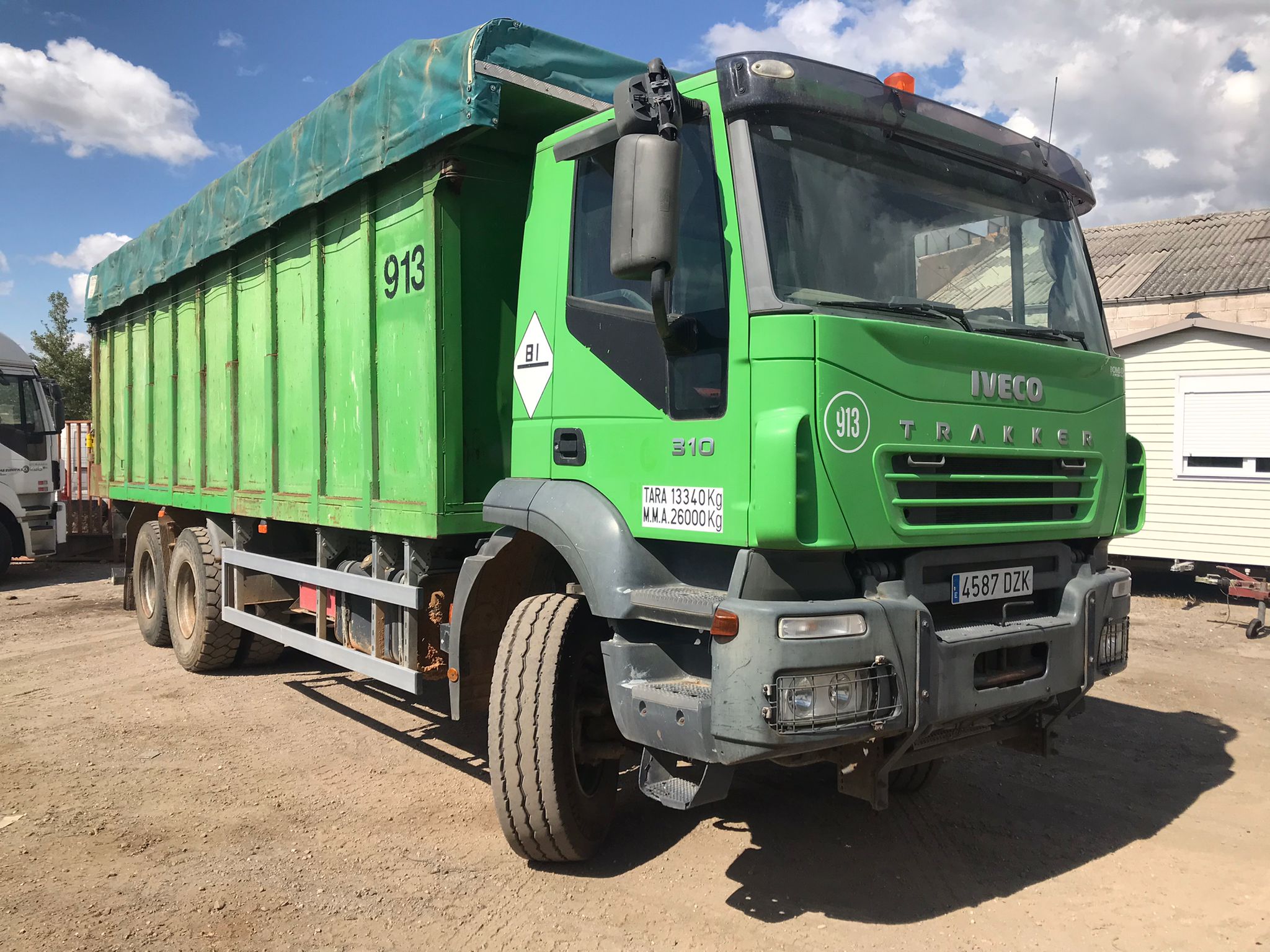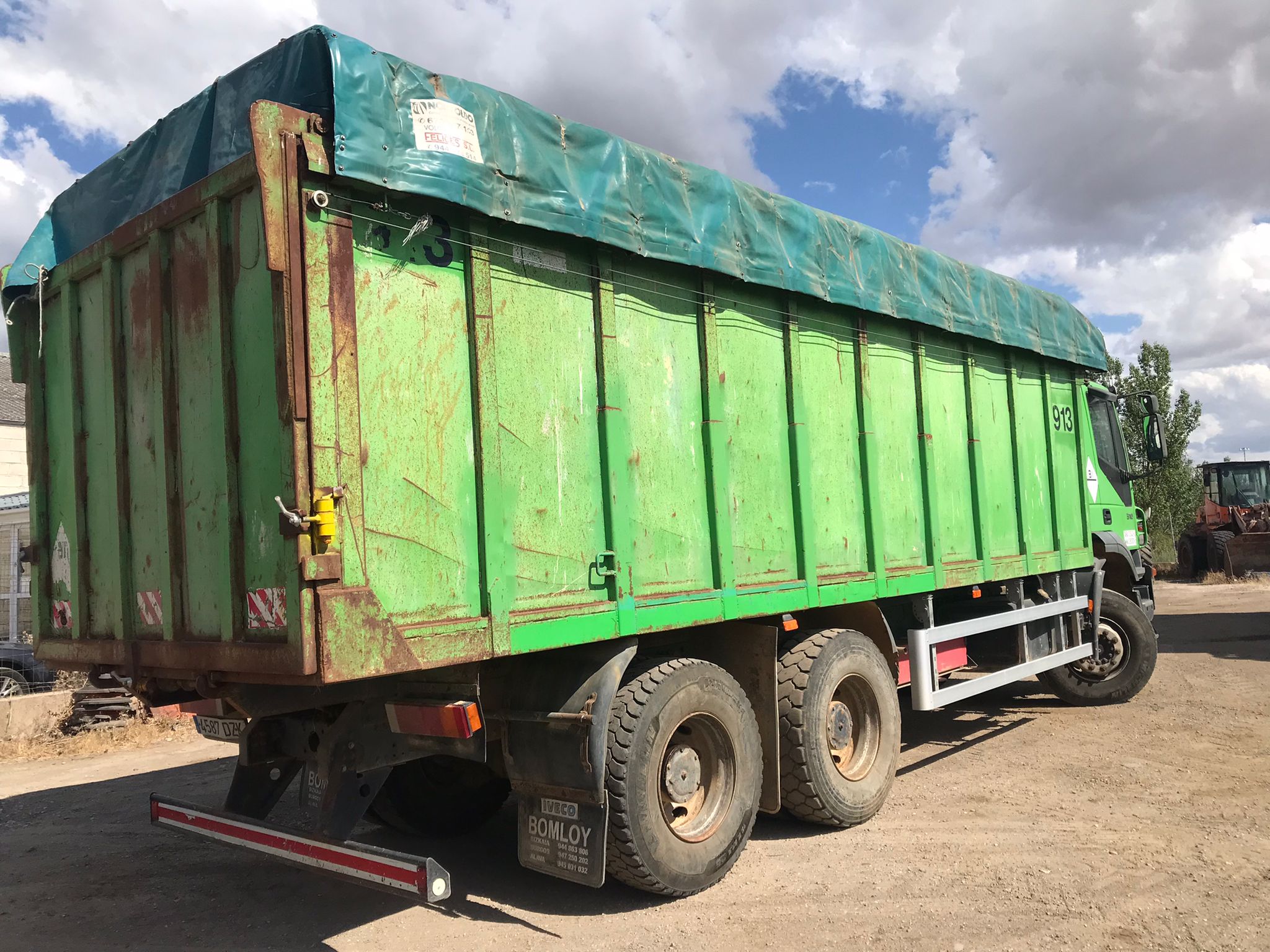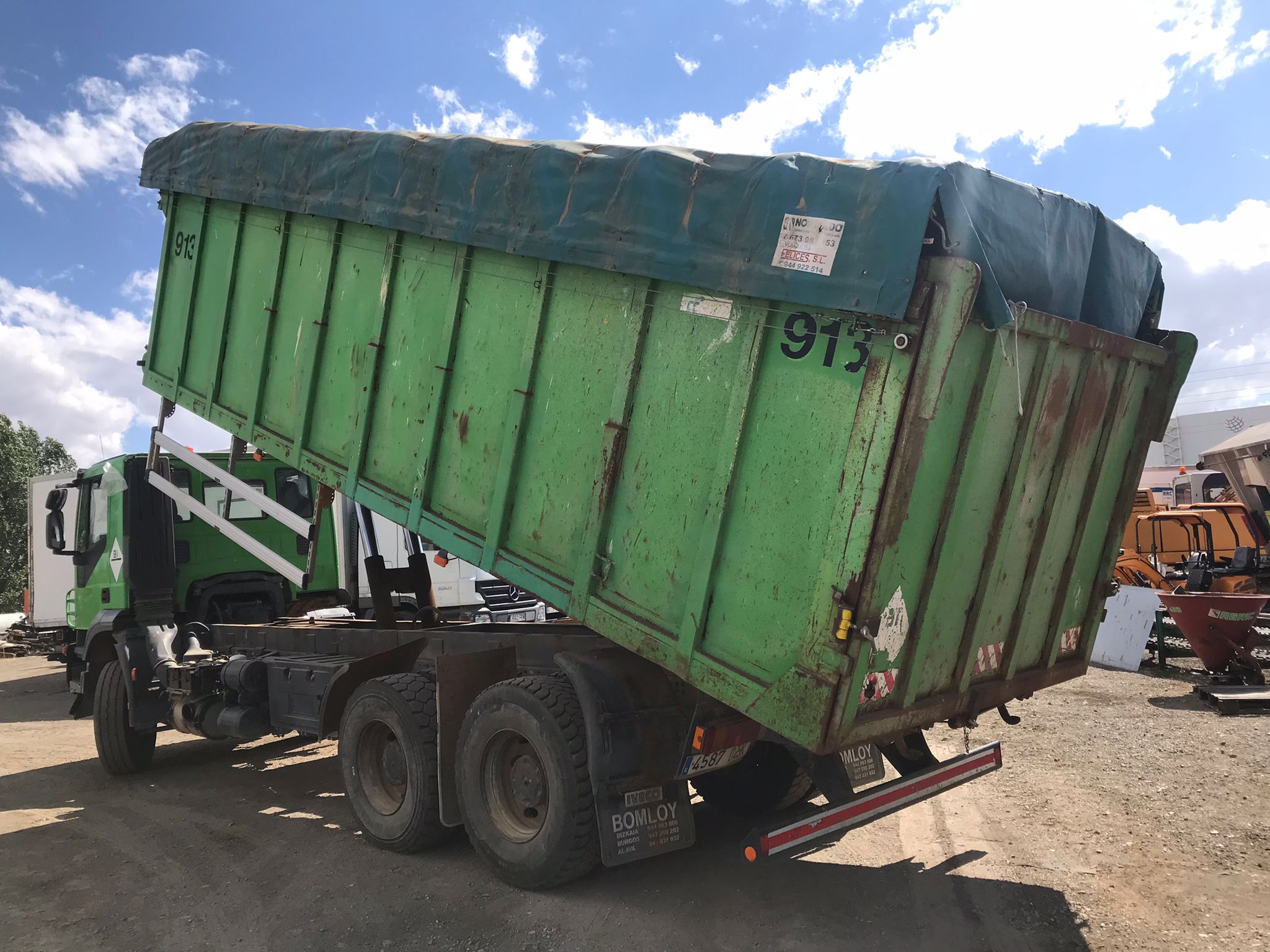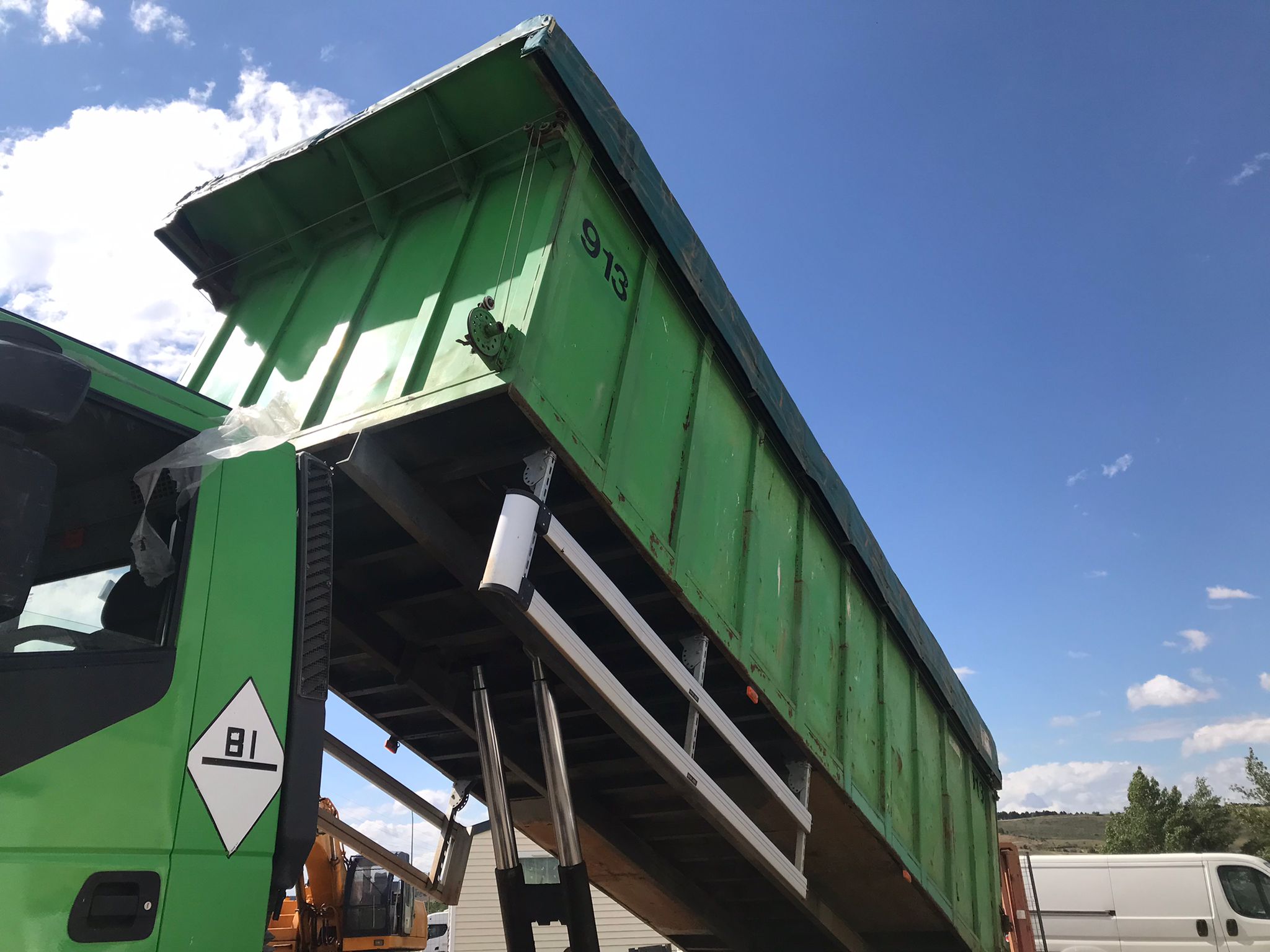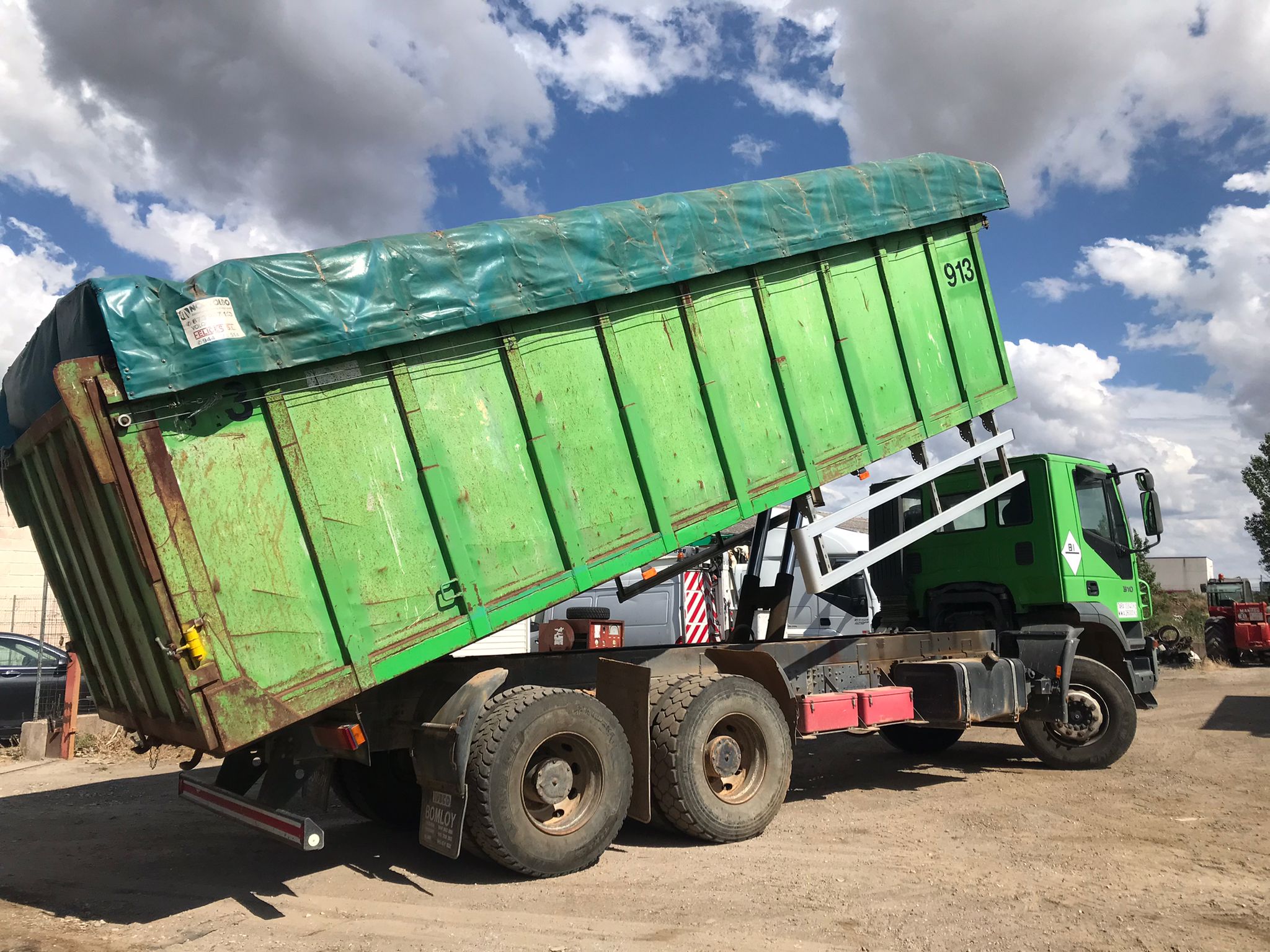 - Caja basculante de hierro (medidas exteriores 2,53 m ancho x 7,60 m de largo x 1,90 m de alto, 34,00 m3 de capacidad aproximada.