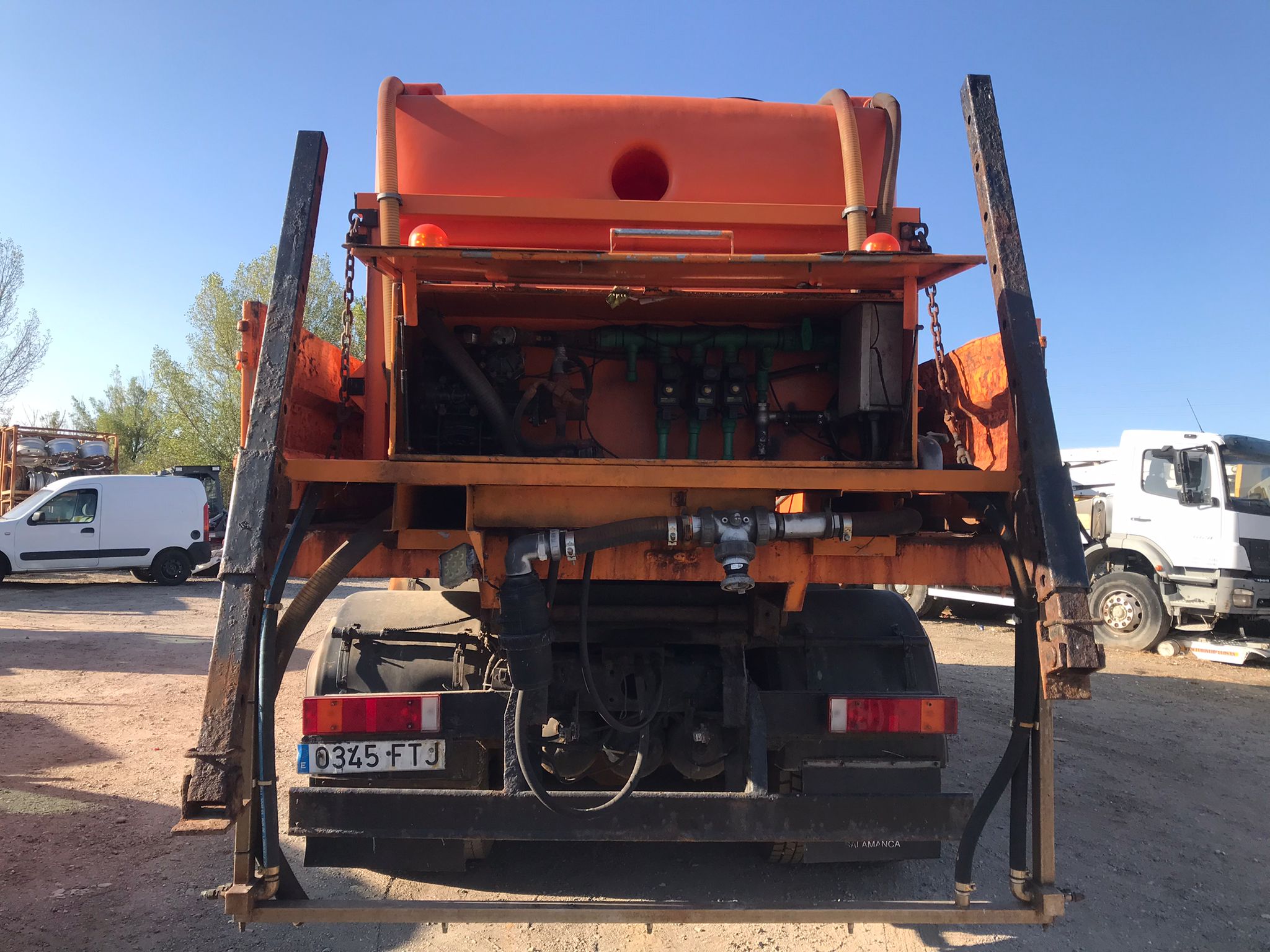 En el apartado de equipamiento, el Iveco AD260T41 está dotado de placas portaimplementos frontal y lateral, lo que facilita la instalación de cuchillas quitanieves y accesorios adicionales. El uso bivalente está reforzado con la incorporación de un esparcidor de sal Infonorte modelo Hércules variante 12.000 L, diseñado para un rendimiento intensivo en temporadas de nieve y hielo. Gracias a su depósito de gran capacidad, permite cubrir largas jornadas de trabajo con eficiencia.