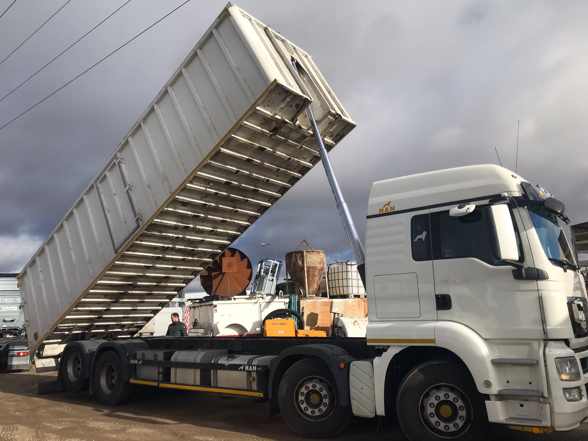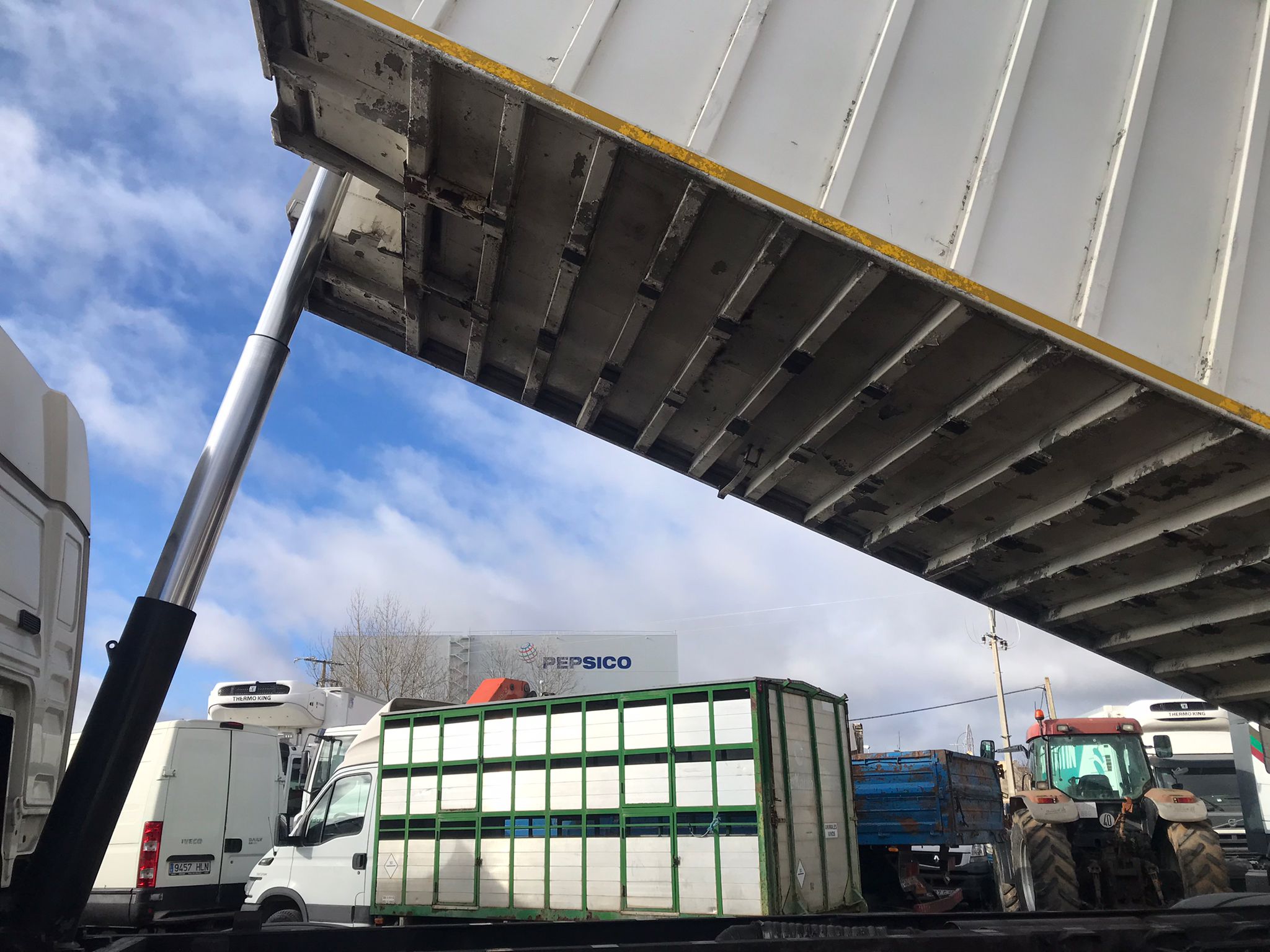 La caja basculante de aluminio tipo harinera, con capacidad aproximada de 45 m³, dispone de descarga neumática mediante sinfín trasero, lo que permite un vaciado rápido y completo en apenas 3–4 minutos, sin depender de la gravedad. Este sistema evita atascos, reduce tiempos de descarga y permite trabajar en instalaciones donde no es posible bascular completamente.