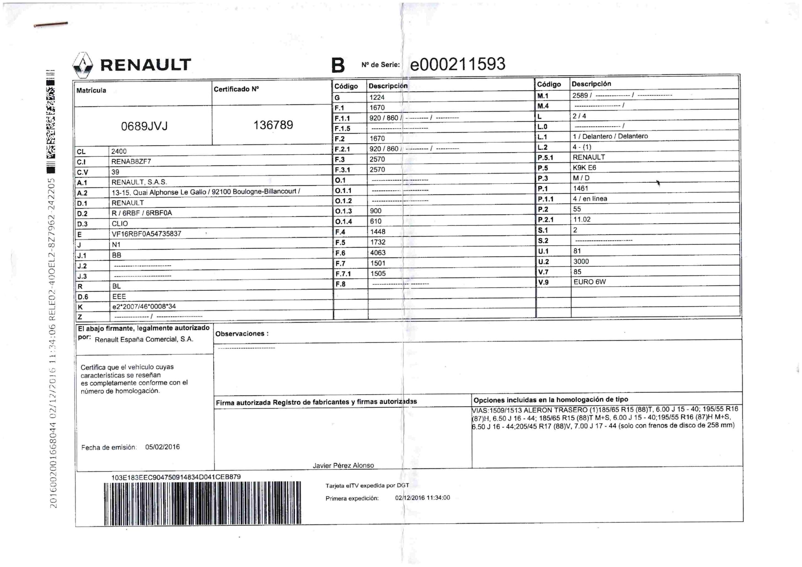 - Fecha de primera matriculación 02/12/2016