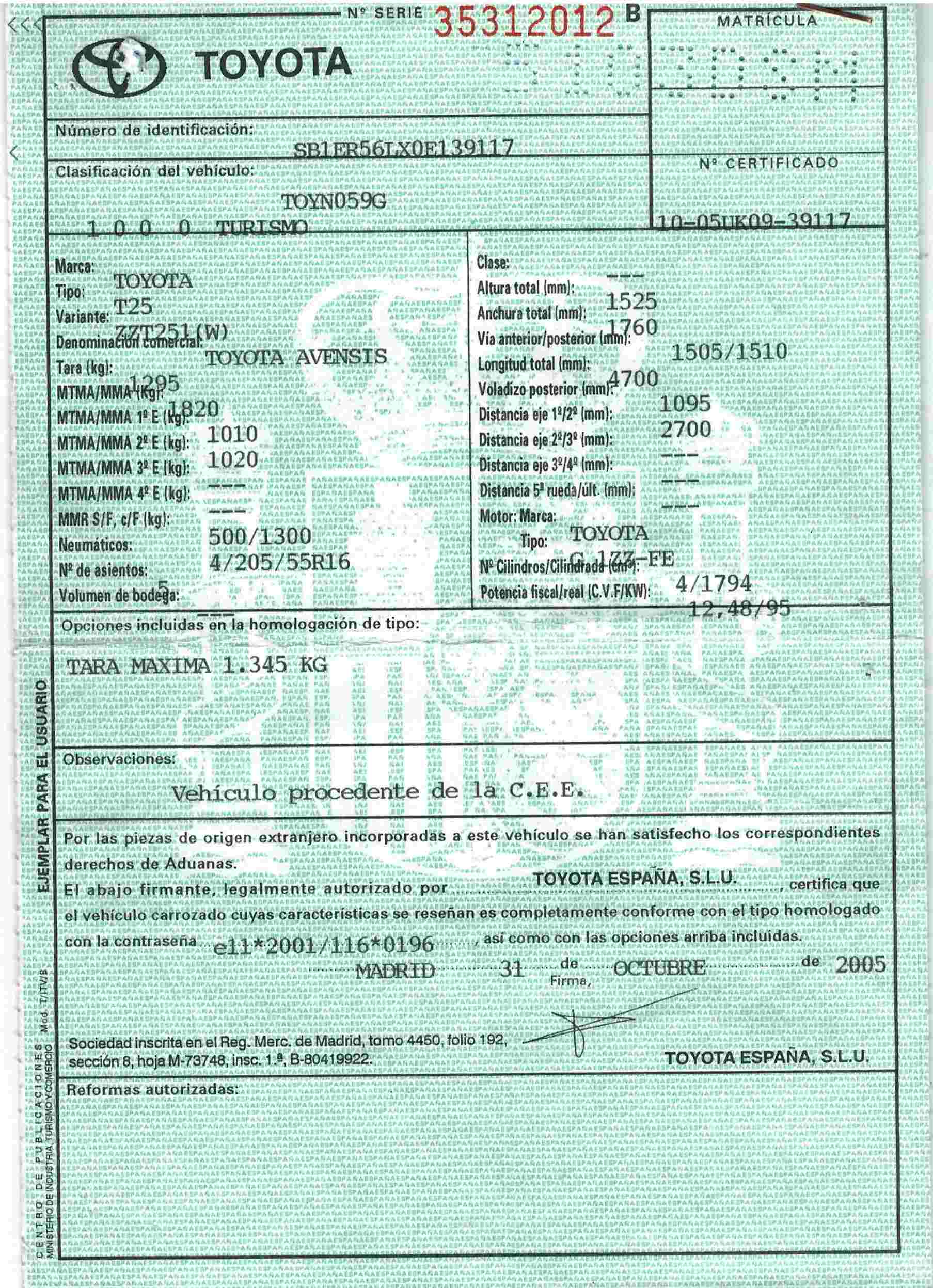 - Fecha de primera matriculación 16/11/2005