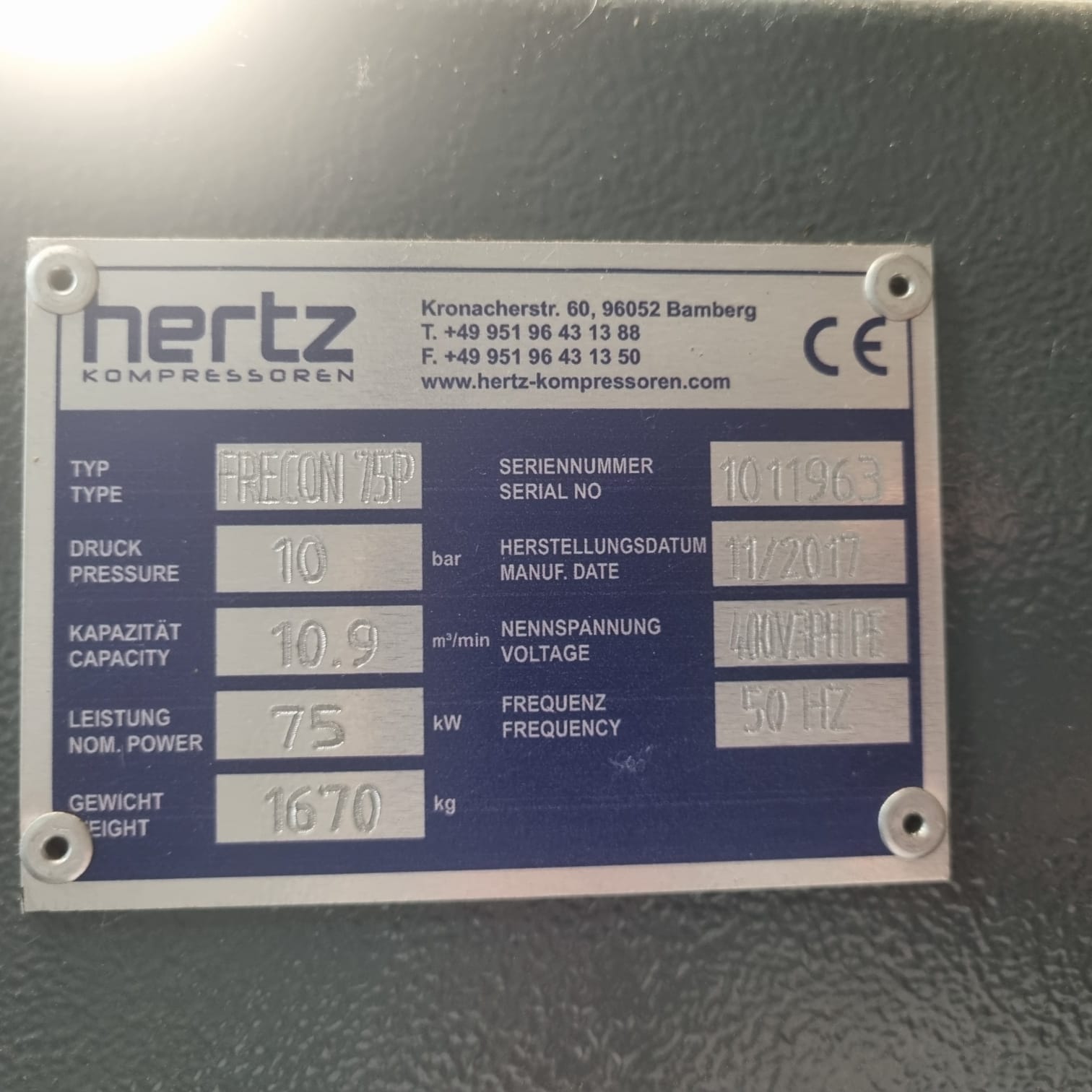 Fabricado en noviembre de 2017, este compresor de la gama FRECON Plus de Hertz Kompressoren está diseñado para un rendimiento óptimo, bajo nivel sonoro y mantenimiento sencillo.