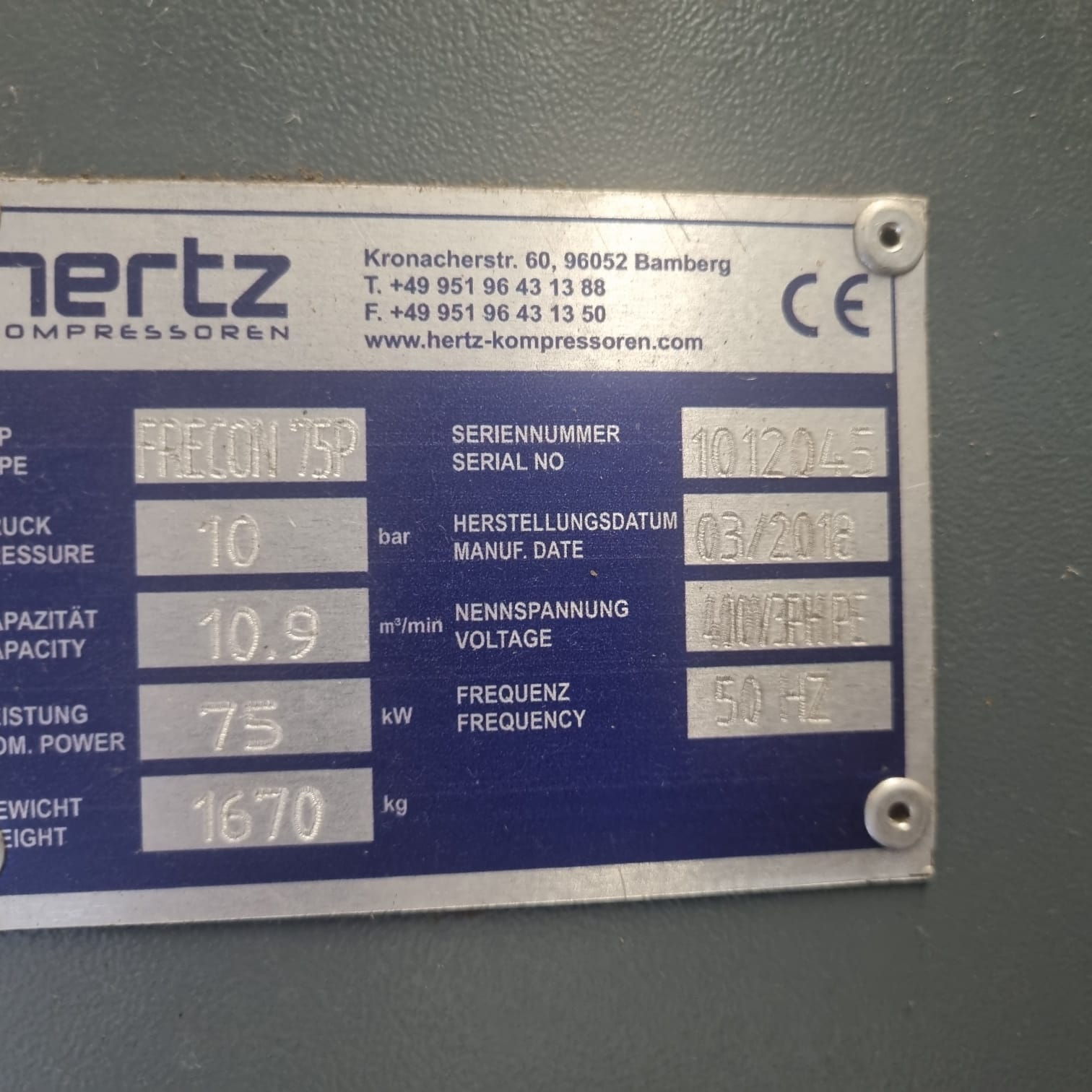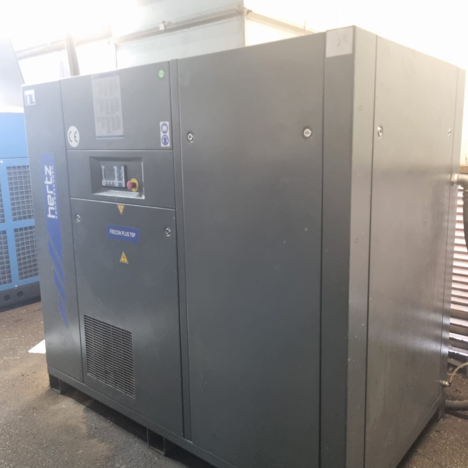 Se vende compresor de aire industrial Hertz FRECON 75P de 75 kW de potencia, fabricado en diciembre de 2018 por Hertz Kompressoren (Alemania), marca reconocida internacionalmente por la fiabilidad y eficiencia de sus compresores de tornillo.
