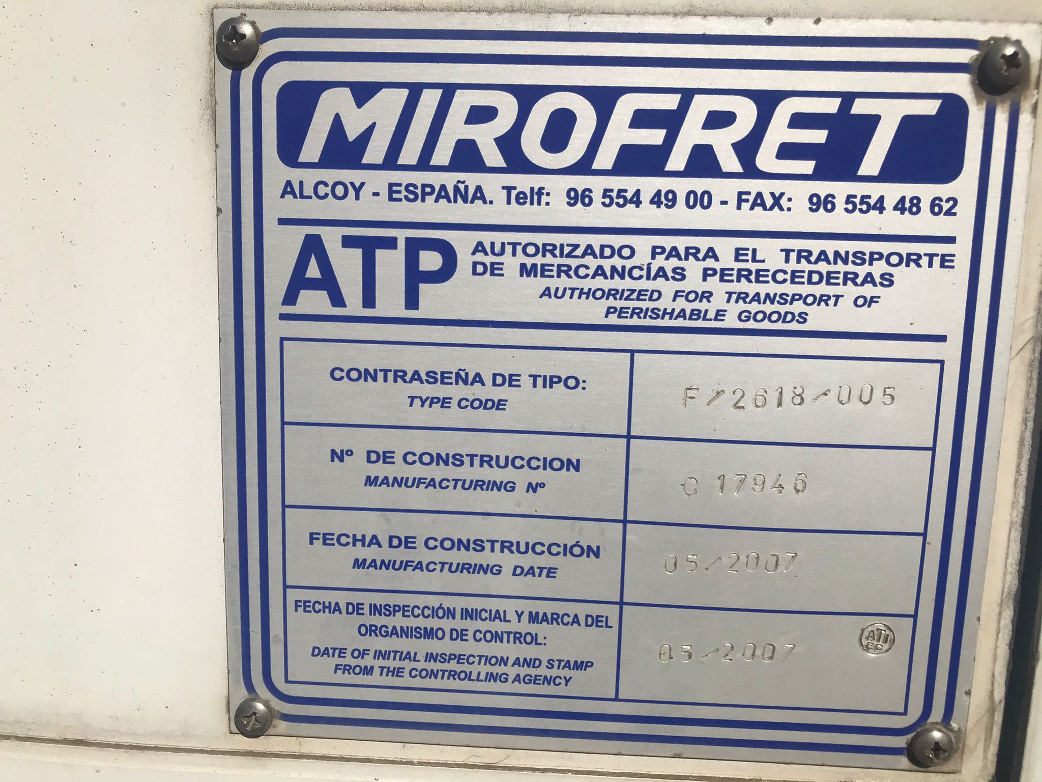 - Caja frigorífica con fecha de construcción 11/05/2007