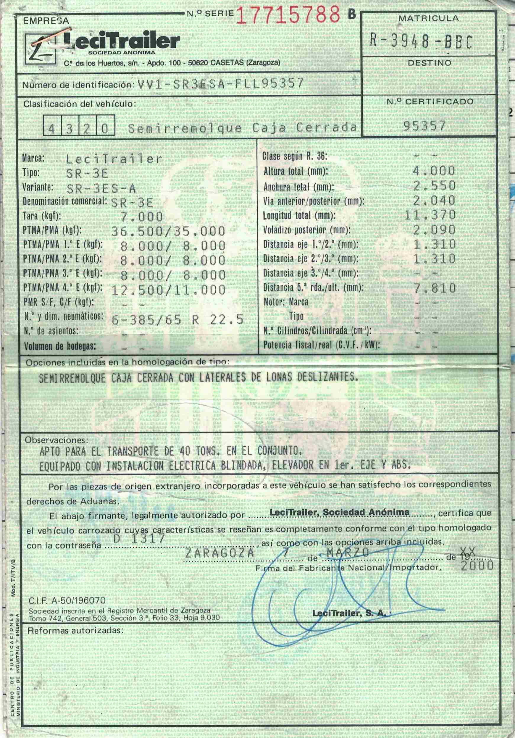 - Fecha de primera matriculación: 13/03/2000