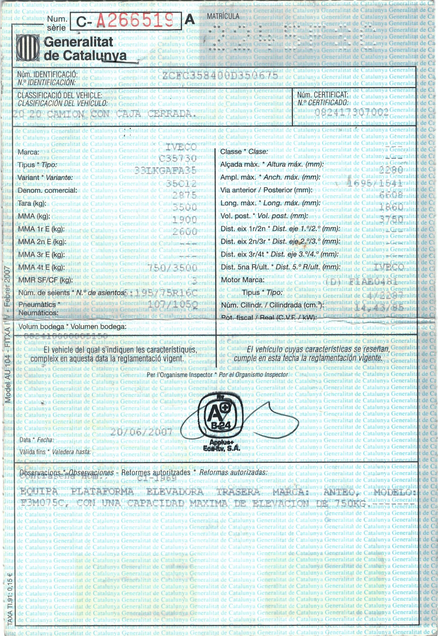 - Fecha de primera matriculación: 27/06/2007