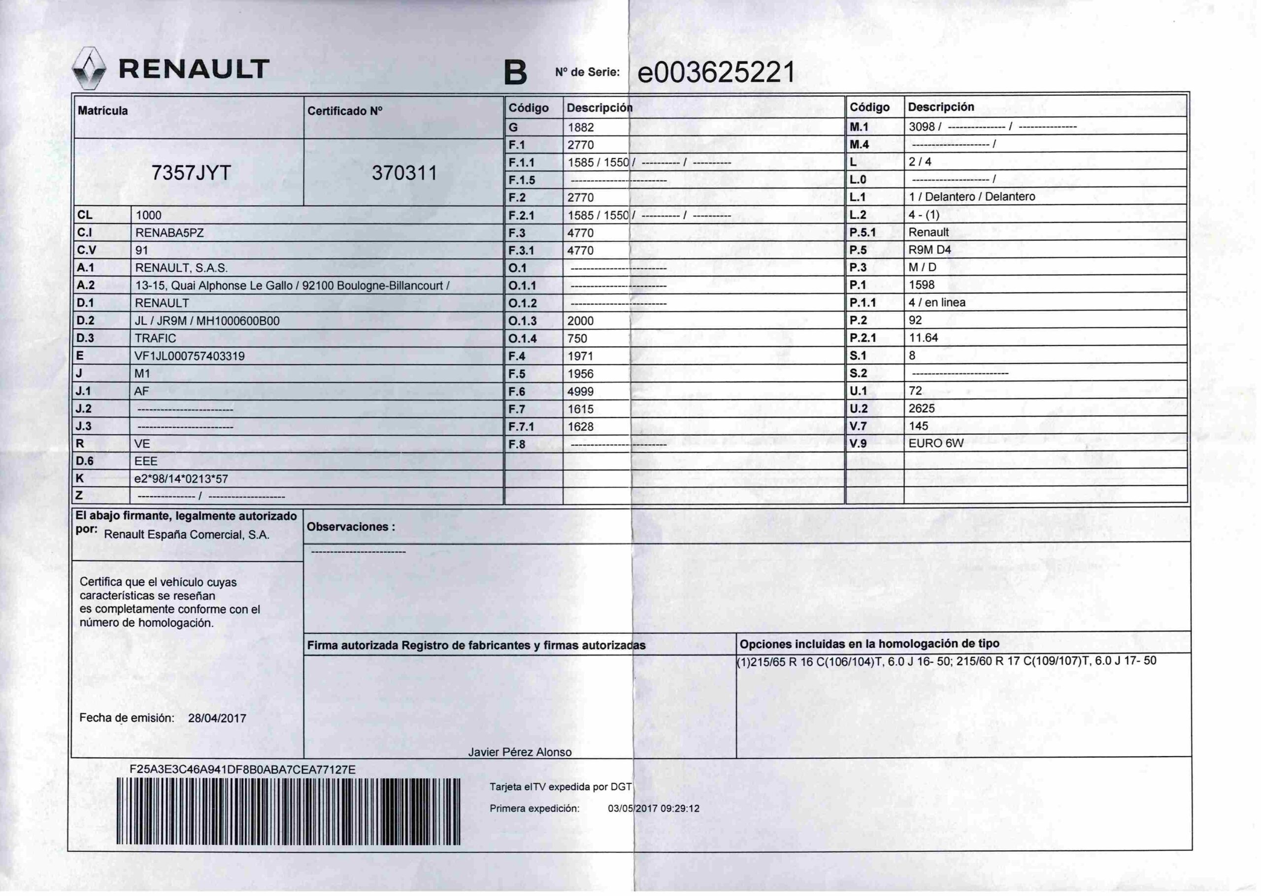- Fecha de primera matriculación: 03/05/2017