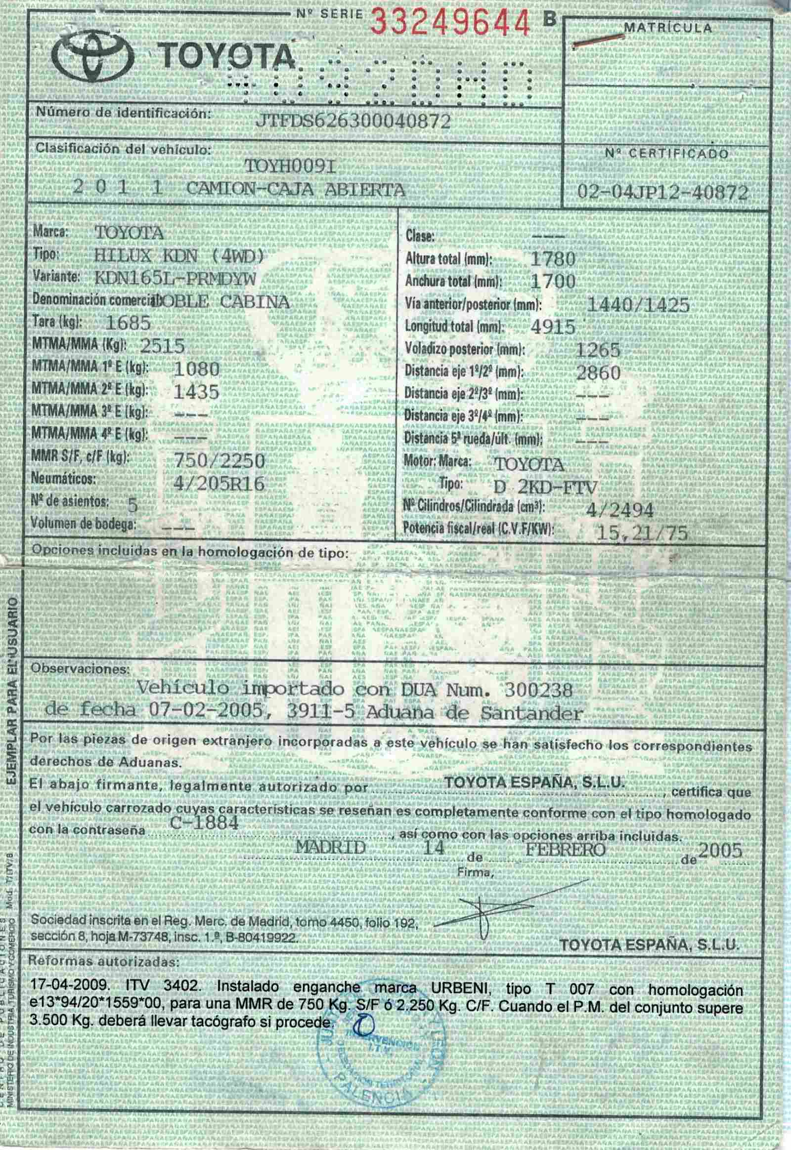 - Fecha de primera matriculación: 08/03/2005